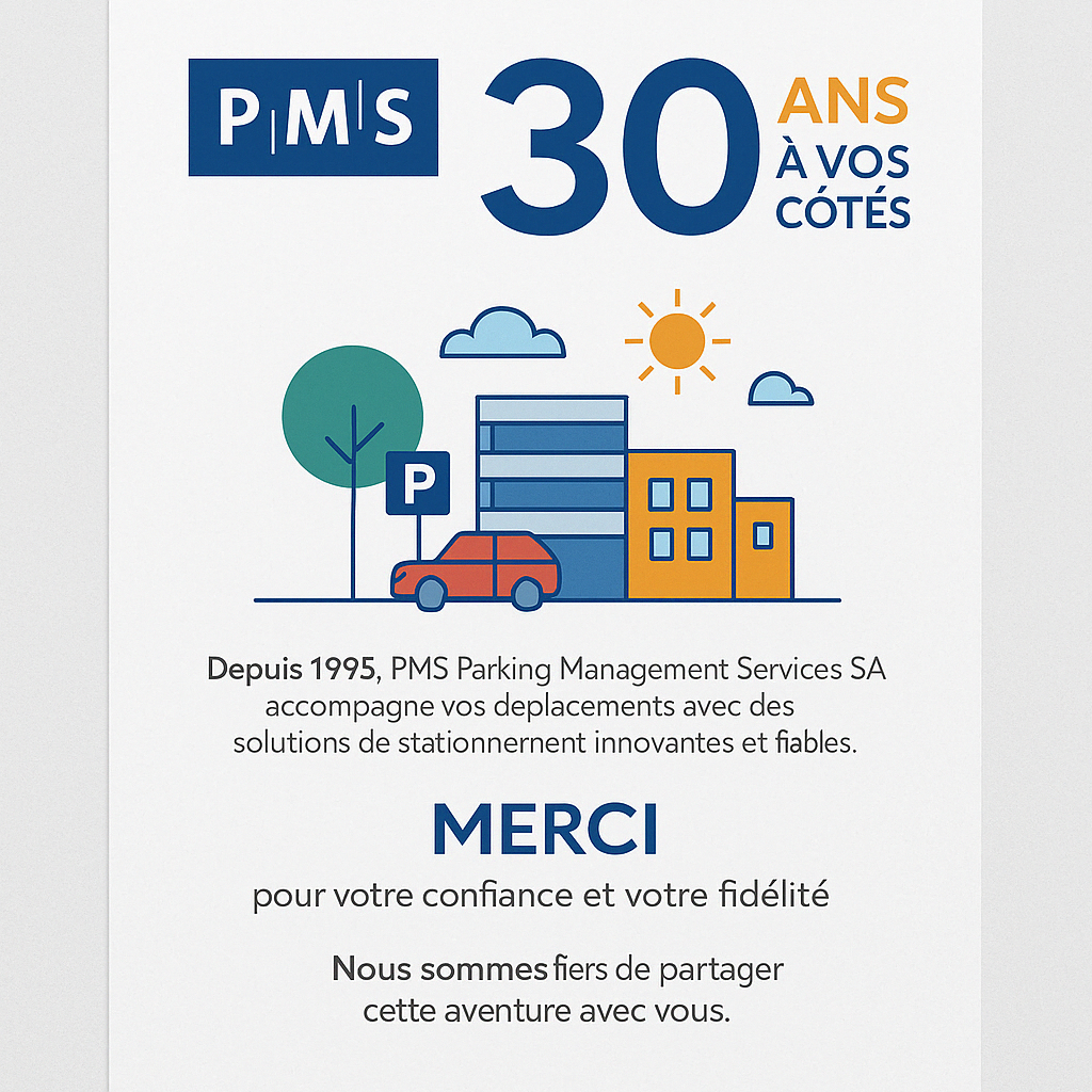 À l’occasion de nos 30 ans, PMS Parking Management Services est heureux de vous présenter son nouveau petit film qui raconte l’histoire et les valeurs de PMS. Ce film dynamique illustre notre engagement constant à optimiser la gestion des parkings, tout en intégrant les enjeux de développement durable et de responsabilité sociétale.